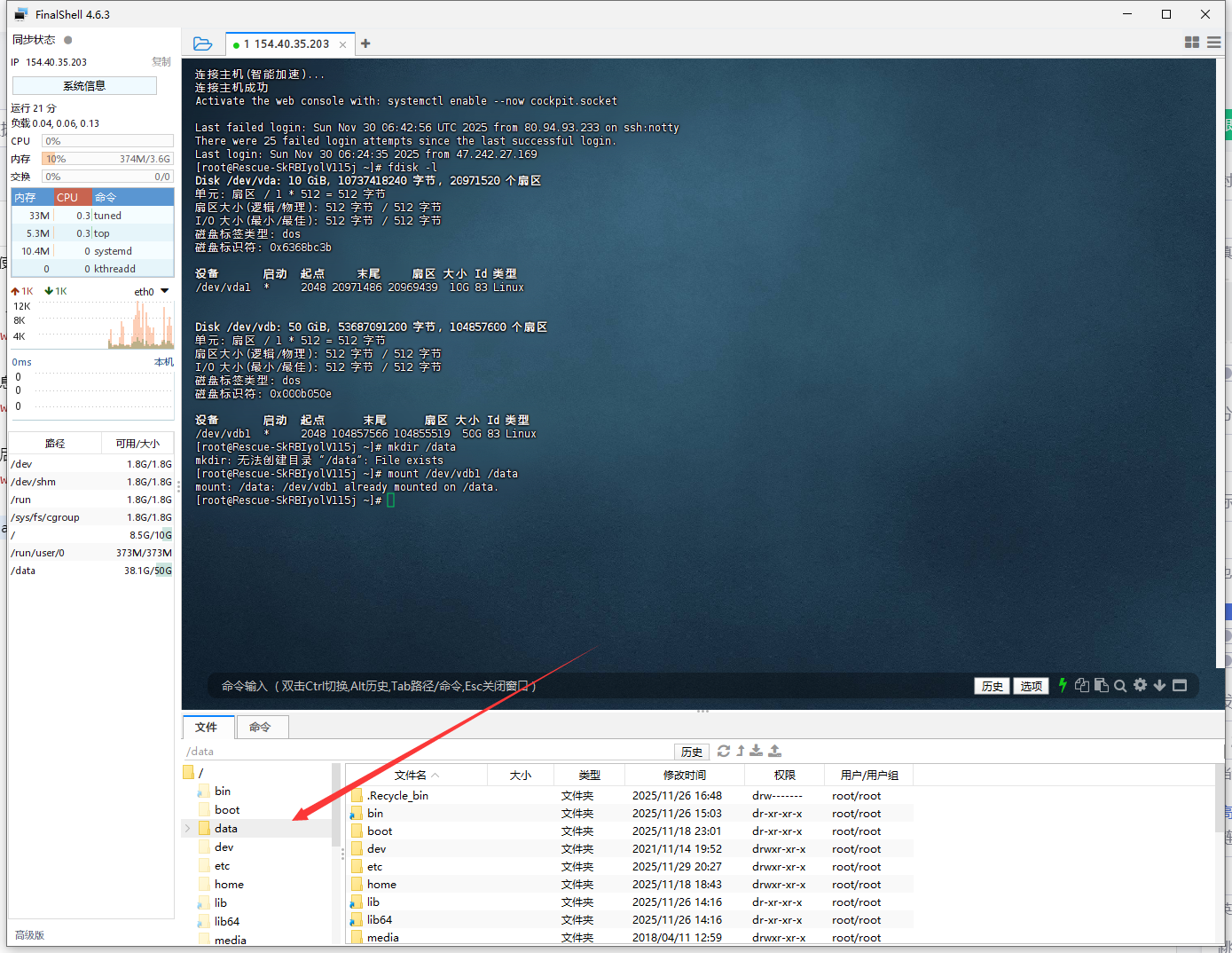 2.获取到硬盘信息后执行命令:mkdir /data 创建挂载目录